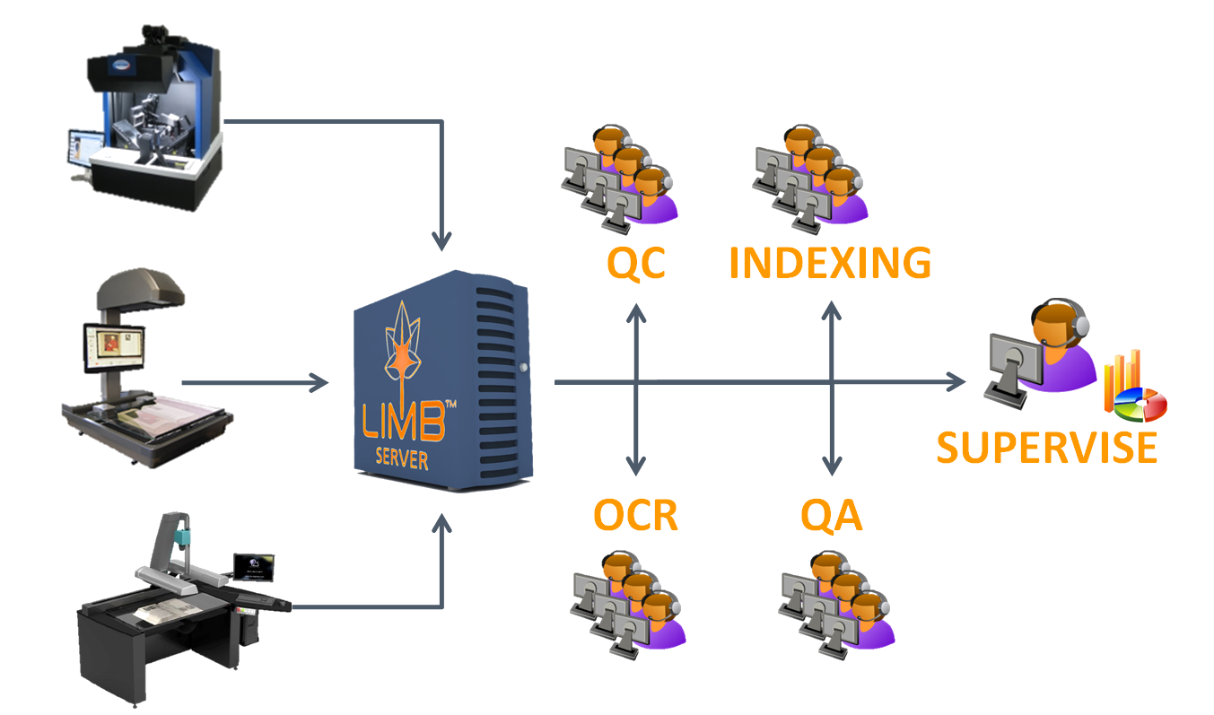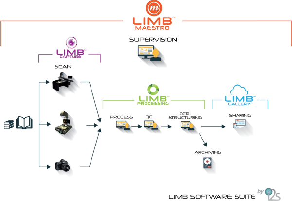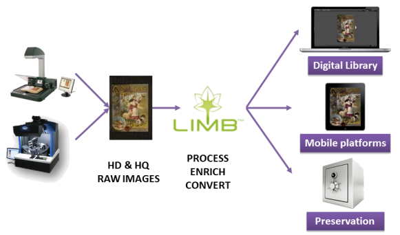 LIMB™ is a complete content conversion solution and includes all the required tools for today’s digitization projects, including project inventory, image processing, quality control, OCR, document structuring and multiple format exporting for long-term archiving, digital libraries or POD.